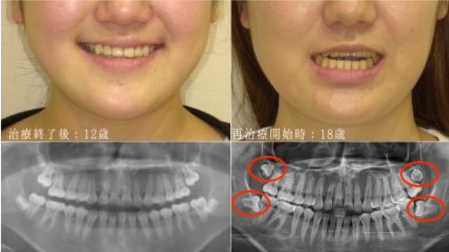 治療終了後は、保定装置(歯並びを安定させる装置)をきちんと使用しており、しばらくの間は歯並びも安定していました。しかし12歳以降は、永久歯がほぼすべて生えそろっていても、あごの成長が続き、8番(親知らず)が動き始める時期でもあります。