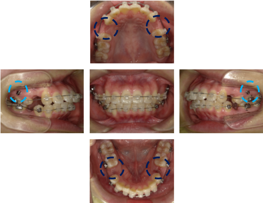 これにより、歯を後ろへ下げるためのスペース(余白)を確保します。水色で示しているのはアンカースクリューです。口ゴボの改善では、アンカースクリューを固定源として使用し、
